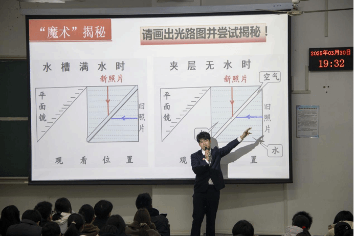 倪佳骏以川剧变脸为导引激发学生兴趣,通过三角形狭缝中是否注水,展示了光从一种介质进入另一种介质时的折射和全反射过程。实验中,红白脸图案的位置变化直观地说明了全反射的发生条件,加深了学生对于全反射的理解。生活中还存在着许多全反射现象,倪佳骏向大家介绍了其中一种——光导纤维。他通过一个“听歌识曲”的小游戏介绍了光导纤维的奇妙用途:用激光发射器把电信号传递成光信号,经光纤传输传到接受器,接受器再把光信号变为电信号传输到喇叭,美妙的校歌孕育而生。倪佳骏还分享了华裔科学家高锟在光纤研究中的故事,激励学生勇于探索、追求科学梦想,将理论知识应用于实际。整堂课下来,倪佳骏以其扎实的专业知识、诙谐幽默的讲课模式以及生动的实验演示,向同学们展示了一节优秀的高中物理示范课。