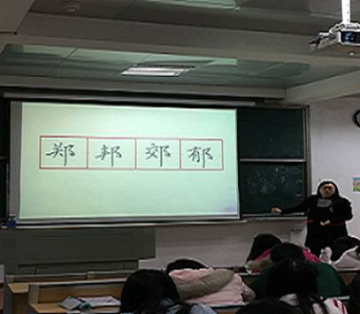 介绍完基本的偏旁部首后,邱婷向大家讲解了钢笔字书写的重要一环——临写。她强调:“临帖时首先应仔细观察范本,谨慎落笔并反复校对”。同时利用PPT展示了书写在田字格中的四个字:“郑、邦、郊、郁”并要求学生仔细观察,自由摹写。在此过程中训练指导团成员也走下讲台,来到同学们身旁细心察看,或纠正笔误,或亲身示范,一笔一划耐心指导。
