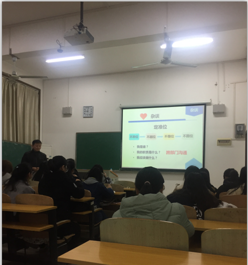 如何倾听?如何反馈?如何表达?一个个问题在大家心中激起涟漪。军令的错误传达、小王和小李对上司的不同回复、卖橘人与顾客买卖过程的不同场景呈现……侍禹廷借一个个生活中的事例向大家介绍了“沟通频道”同时的重要性。此外,针对同学们如何准确把握信息的问题,侍禹廷特别强调了信息中的5W2H(七何分析法)。在此过程中大家或认真倾听,或互相讨论,或独立思考,或大胆提问,侍主席更充分发挥特有的亲和力与大家频频互动,在一问一答中深刻诠释了正确“沟通”所带来的良好效果。