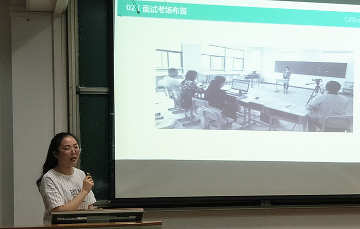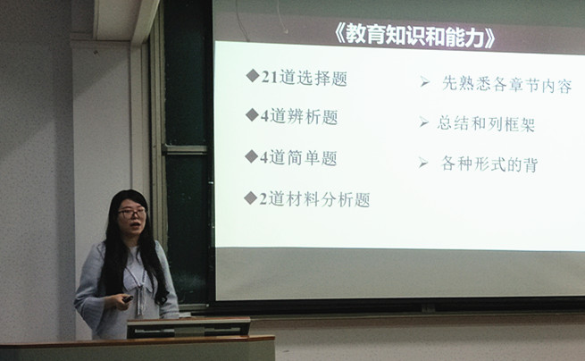 活动伊始,赵倩为同学们简单介绍了教师资格证的考试科目,共有两大类:笔试和面试。笔试包括《综合素质》、《教育知识与能力》、《学科知识与教学能力》3科;面试则包括抽题、备课(活动设计)、回答规定问题、试讲(演示)、答辩(陈述)等环节。面对如此纷繁复杂的考试门类,该从何处入手准备呢?赵倩为大家一一细致解答。笔试中第一、第三科较为容易,多做真题、主动总结规律即可,《教育知识与能力》却有大量的记忆任务,要求应试者十分熟悉各章节内容,掌握答题模式。相比之下,面试的备考更加复杂和艰辛。以英语学科为例,教师仪态、英语基本知识、口语发音和表达等都是需要努力提升的方向。对此,赵倩还建议两人组队,互相听评课、彼此指正缺陷,一起快速提高。