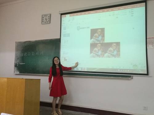 活动进行到后期,在台下同学们热情建议下,王天娇向同学们简单讲述了PPT快闪的制作方法。并着重强调了为什么要在众多的文字中插入一张图片:“这个PPT里面都是字,很容易使观众造成视觉上的疲劳,加入一张图片有利于减缓播放的步骤,可缓解视觉冲击效果,更利于观众接受。”