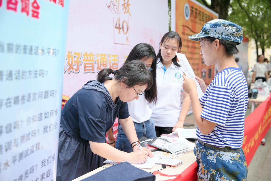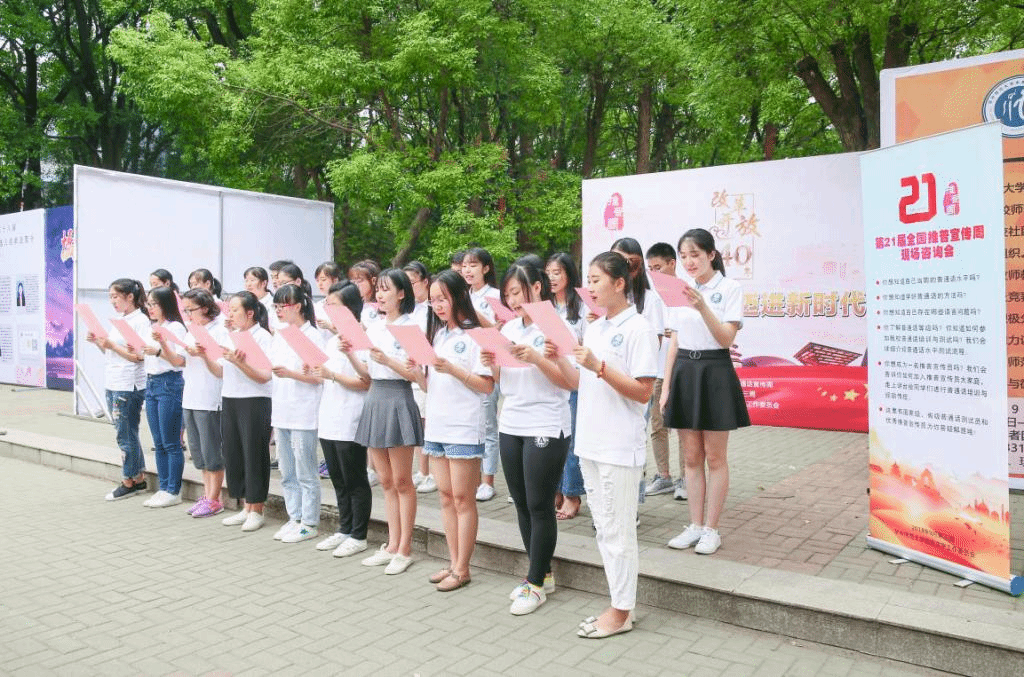 校推普宣传员身穿统一推普文化衫,推普周期间每天在桂香园、学子餐厅前设立宣传点,开展推普现场咨询活动。推普员们现场为同学们宣传国家语言文字政策、示范普通话的正确读音、分享学习普通话的心得体会,为他们解疑答惑;国家级普通话水平测试员到场为学生做普通话模拟测试;推普员们还集体当众诵读诗歌《中国话》,他们落落大方的示范、诵读吸引不少学生驻足、询问、测试。