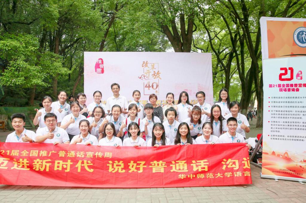 线下,在校园主干道设置推普宣传标语导旗14幅,在教学楼、食堂、图书馆张贴宣传海报,在人群密集的地方树立“说好普通话,迈进新时代”的巨型喷绘,教学楼电子屏滚动播出推普公益广告视频。校语委还精心制作“第21届全国推广普通话宣传周暨华中师范大学语言文字工作汇报展”在校园橱窗公开展出。