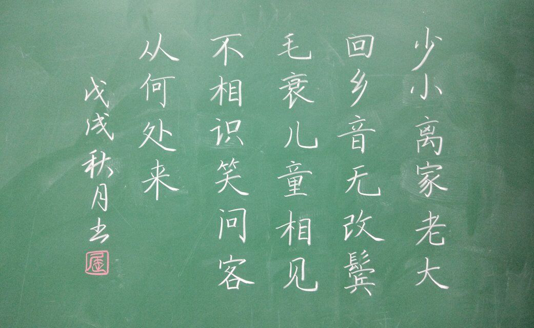交流结束后,指导团成员以《回乡偶书》为练习内容进行常规粉笔字书写练习。