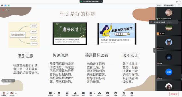 (通讯员 晏如 姜阳)7月7日,“当代师范生”微信运营部借助腾讯会议开展小学期线上策划会暨标题培训活动。会议由副部长晏如主持,研究生助理姜阳及部门成员共同参与。