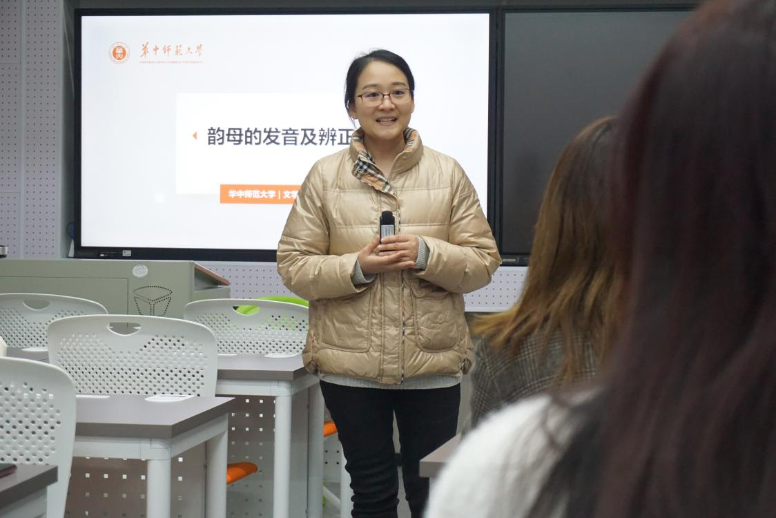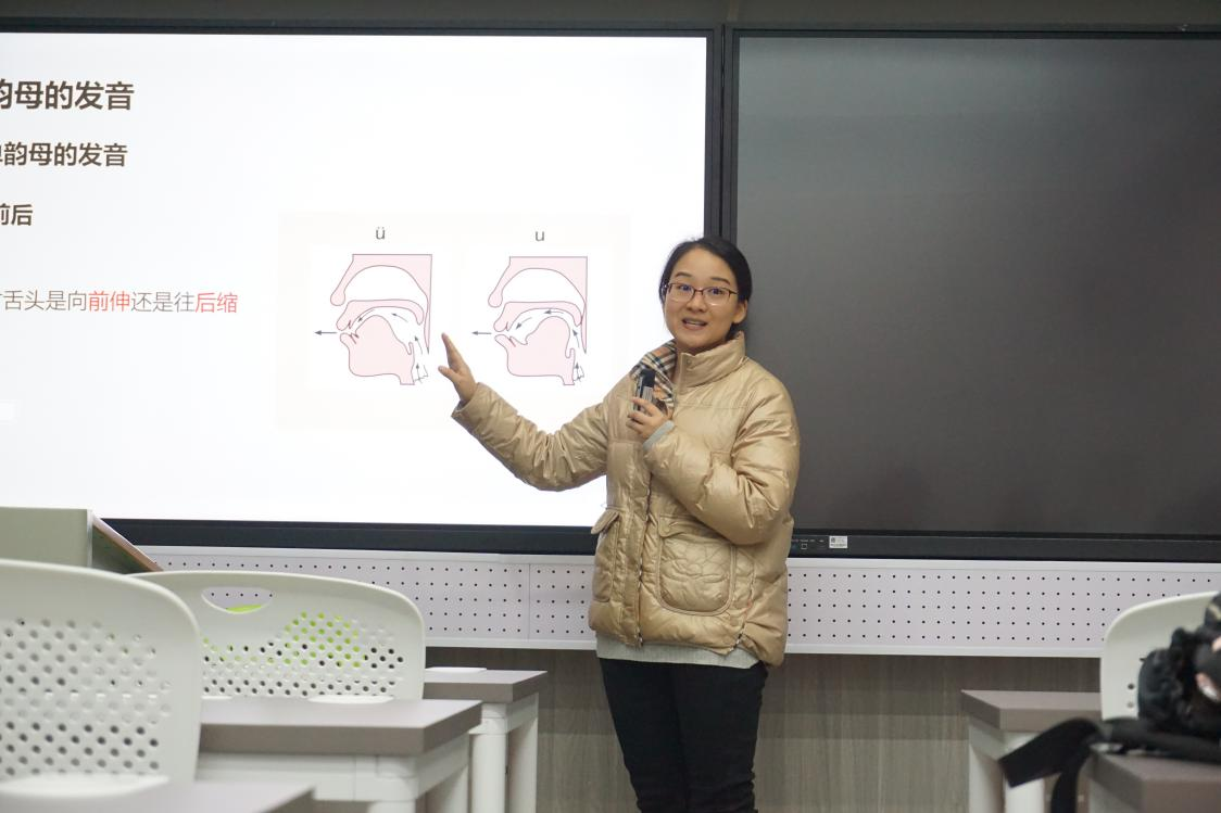 当代师范生讯(记者:李娜 胡新怡)为了提升我校推普员的普通话发音水平与教学能力,为新学期师范生普通话培训及普通话推广工作蓄积力量,3月18日,口语指导团(暨校推普团)新学期第一次专业培训在教师教育学院A106教室举行。国家级普通话测试员、我校文学院硕士生导师陈蓓主讲“普通话韵母的发音与辨正”。