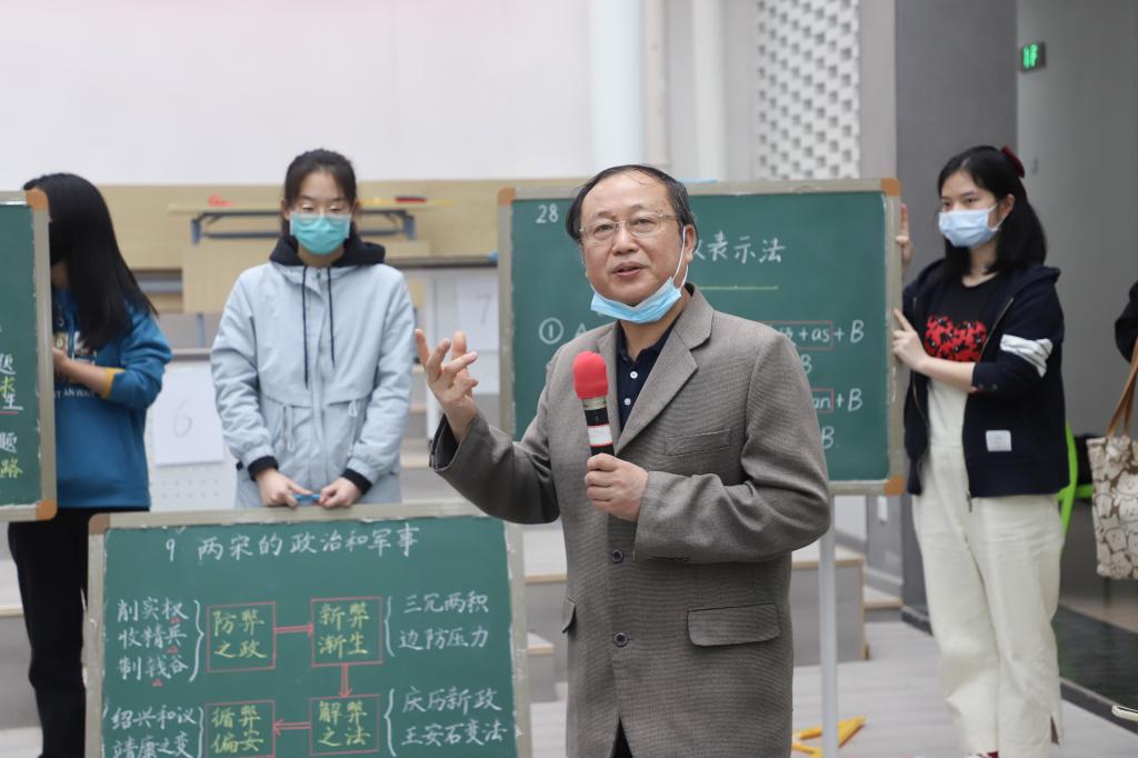 马志祥表示本届比赛选手在知识解题、板书设计上有明显提升,板书要重视宏观设计、重视内容的示范性与直观性。毛德胜重点强调了板书的书写速度,提醒选手把握好下笔的轻重分寸,合理控制疾缓。吴洪涛建议用白黄颜色书写内容和重点,红色圈画标记,使板书效果更加清晰。曹海东以四位选手的字体为例,指出点画要有轻有重、有疾有徐。汪国胜在总评中指出,良好的板书是教师形象的展示,师范生首先要重视汉字的书写,不仅是中华文化传承的需要,而且是教师职业发展的需要,师范生应以比赛为起点,坚持汉字书写,在实践中传承中华优秀文化。