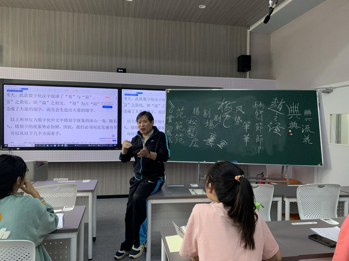 书法教师陈龙海,在上午培训的基础上围绕“书写要点”呈现了一堂趣味性与知识性相结合的课堂。他将板书呈现和口述讲解相配合,从笔画结构、控笔等多方面为同学们讲解各类书写要点,还借助视频向大家介绍如何读帖、临帖。