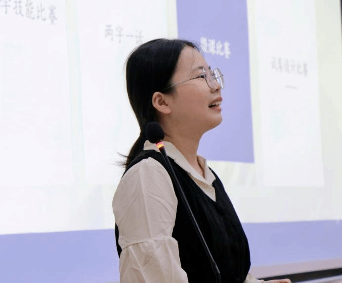 向璐以 “三尺讲台,四季耕耘”为题,从备课和试讲两方面阐释如何上好一堂课。她将备课分为备教材、备教学、备学生三部分,师范生要熟悉教材、探寻教学方法及发挥学生主体作用。向璐从板书与语言两部分展开试讲内容,她表示,语言既包括口语也包括身体语言,身体语言涉及眼神交流,体态手势等。