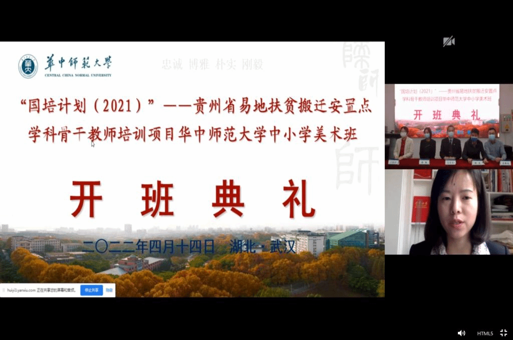 4月14日下午,贵州省“国培计划(2021)”易地扶贫搬迁安置点学科骨干教师培训项目(中小学美术)开班典礼在华中师范大学举行。受疫情影响,项目采用中国教师研修网在线同步直播形式举行。华中师范大学教师教育学院副院长吴军其、研修班班主任张继坡、王筱瑨、杨颖,以及来自贵州省的200名中小学美术骨干教师参加了典礼。典礼由中小学教师培训部主任周尤主持。