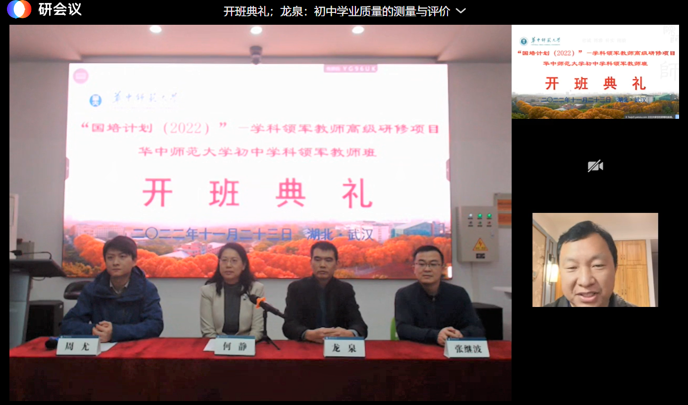 11月23日上午,“国培计划(2022)”——初中学科领军教师高级研修项目华中师范大学班开班典礼在云端举行。华中师范大学教师教育学院院长何静、教师教育学院教师培训部主任周尤、教育部“国培计划”专家库专家龙泉、研修班班主任张继波,以及来自安徽、湖北、湖南、浙江、福建、江西及新疆生产建设兵团的32名学科骨干名师参加了典礼。典礼由周尤主持。受疫情影响,项目采用中国教师研修网在线同步直播形式举行。