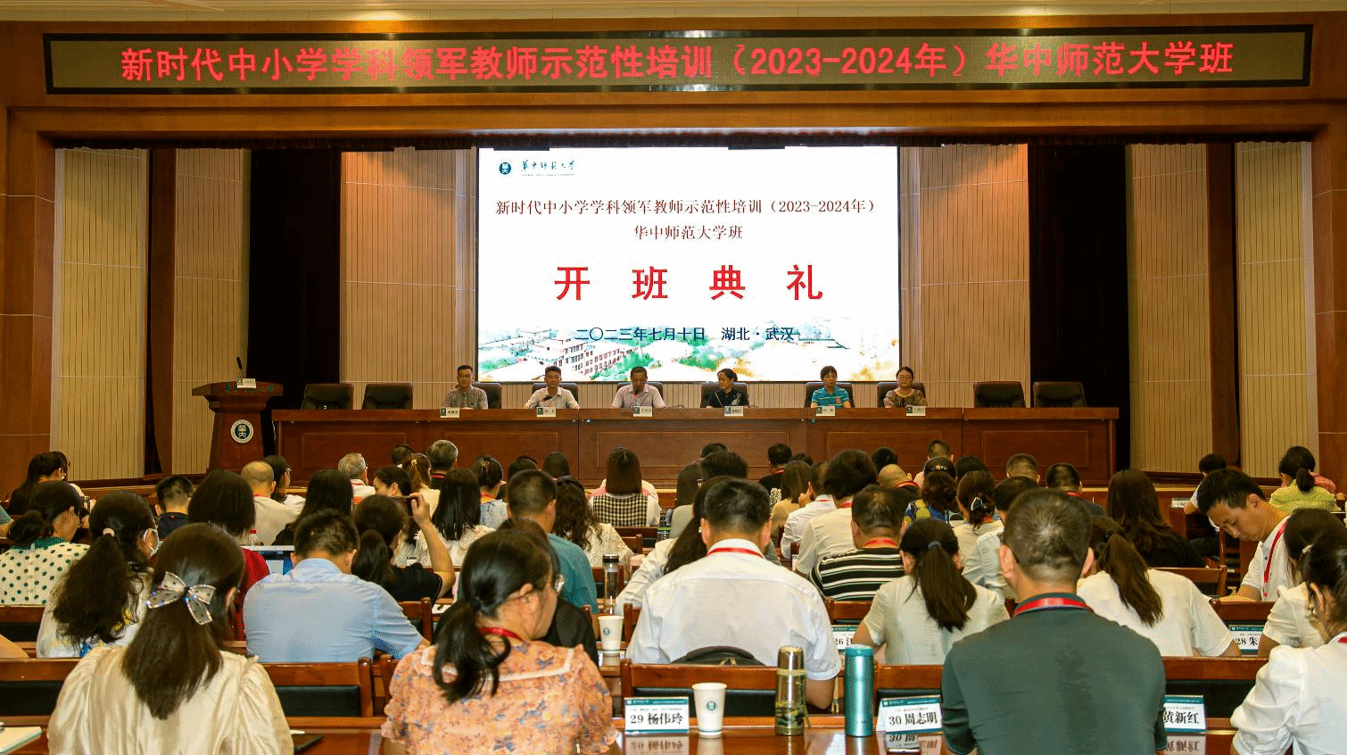 7月10日上午,新时代中小学学科领军教师示范性培训(2023—2024年)华中师范大学培养基地开班典礼在我校科学会堂报告厅举行。华中师范大学教师教育学院副院长吴军其,全国优秀班主任、正高级教师盘晓红,研修班班主任周尤、杨颖、张继波、王筱瑨,以及来自全国10个省份的128名初中数学、生物、语文、地理学科领军教师参加了典礼。典礼由周尤主持。
