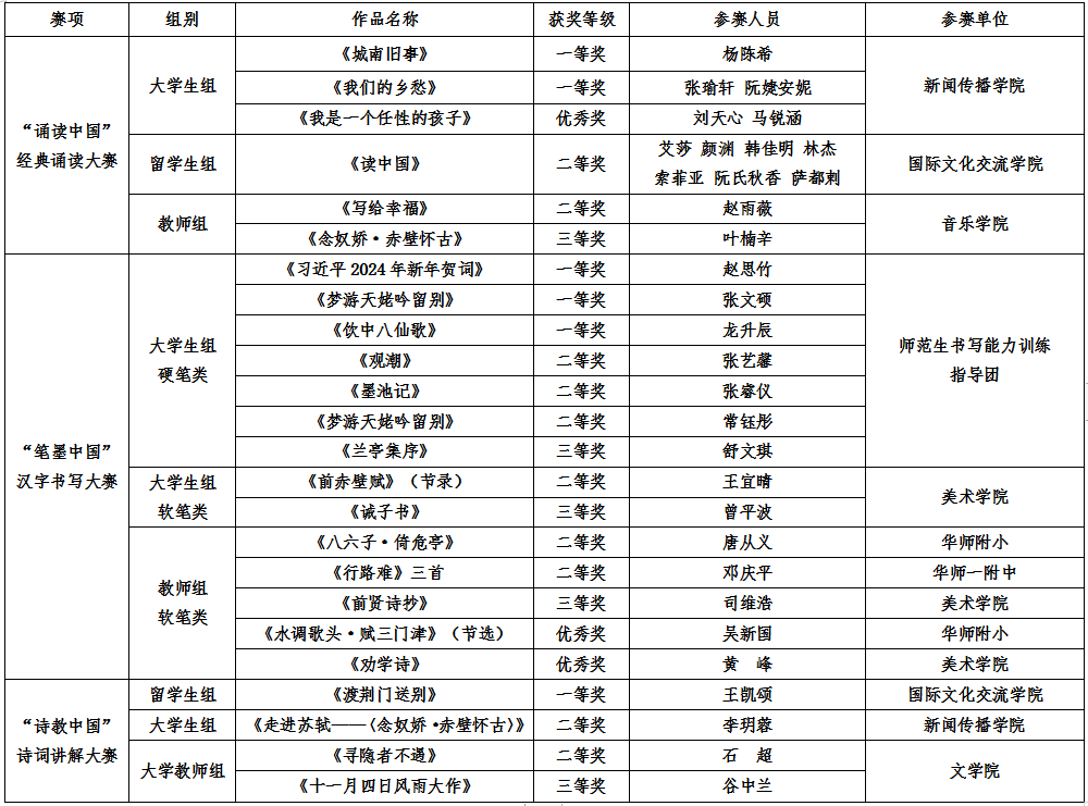 根据《教育部办公厅关于举办第六届中华经典诵写讲大赛的通知》《湖北省教育厅办公室关于在全省组织开展第六届中华经典诵写讲大赛的通知》要求,校语委办(教师教育学院)于5月初面向全校开展宣传动员工作,组织新闻传播学院、国际文化交流学院、文学院、音乐学院、美术学院以及师范生书写能力训练指导团等单位,进行“诵读中国”经典诵读大赛、“诗教中国”诗词讲解大赛以及“笔墨中国”汉字书写大赛三大赛项的人员选拔、作品指导、视频拍摄剪辑等工作,对参赛作品的内容、形式和参赛者资格进行严格审核。