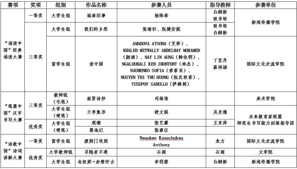 据悉,“诗教中国”诗词讲解大赛留学生组一等奖,湖北省仅我校一所高校入选,“诵读中国”经典诵读大赛大学生组一等奖,湖北省仅有两所高校(含我校)入选。前期,该项比赛湖北赛区竞赛我校共计获奖27项。