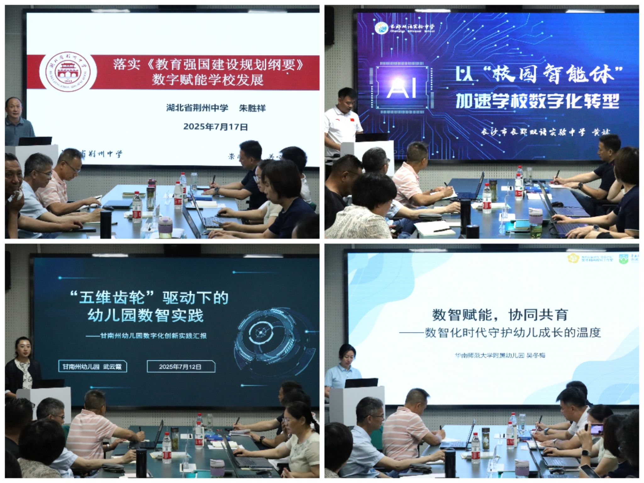 长沙市长郡双语实验中学黄斌校长以《以“校园智能体”加速学校数字化转型》为题,阐述了技术驱动下的校园治理创新;湖北省荆州中学朱胜祥书记聚焦《教育强国建设规划纲要》,探讨了政策引领下数字赋能学校发展的路径;华南师范大学附属幼儿园吴冬梅园长的《数智赋能协同共育——数字化时代守护幼儿成长的温度》,展现了技术与幼儿教育融合的温情实践;甘南州幼儿园武云霞园长则通过《五维齿轮驱动下的幼儿园数智实践》,分享了结合地域特色的数字化探索成果。