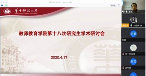 (通讯员 吴梦攀)教师教育学院于2020年4月17日以线上会议形式开展了“第十八次研究生学术研讨会”,全体研究生在“云”端进行学术研讨活动。学院副院长吴军其教授、辅导员罗忻老师及全体博士、硕士研究生参加了此次活动。2017级硕士研究生郭铭寒做了题为“案例教学在小学Scratch编程教育中的应用现状与改进策略研究”的学术汇报,并就相关问题与全体人员进行了分享与交流。