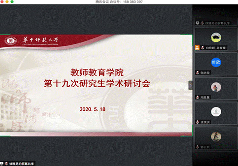 (通讯员 吴梦攀)教师教育学院于2020年5月18日以线上会议形式开展第十九次研究生学术研讨会。学院副院长博士生导师吴军其教授、硕士生导师汪丽梅副教授、辅导员罗忻副教授及全体博士、硕士研究生参加了此次活动。2017级硕士研究生徐雅男做了题为“初中教师惩戒权认识现状研究”的学术汇报,并就相关问题与全体人员进行了分享与交流。