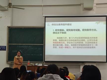 城市与环境科学学院专场,国培骨干教师、许昌高级中学一级教师徐凯红在“高中地理必修二《农业区位选择》”的优质课展示和微讲座中向师范生们分享了自己的教学设计和教学理念,并从地理教学的核心素养、日常备课的注意事项以及地理学科的层次设计等方面向师范生们提供了宝贵经验。