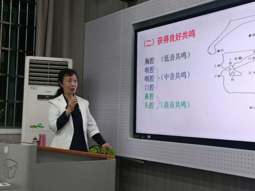 兰霞用图例与演示解说了发声部位与发声原理,以生动的语言和动作示范让大家感受发声时气息的来源与共鸣时咽腔等的运作。她针对气息、共鸣和声音弹性等问题带大家进行呼气练习、声气结合练习、弹发练习、换气补气练习、绕口令练习与呼吸共鸣综合练习等,讲述了练声的具体方法。