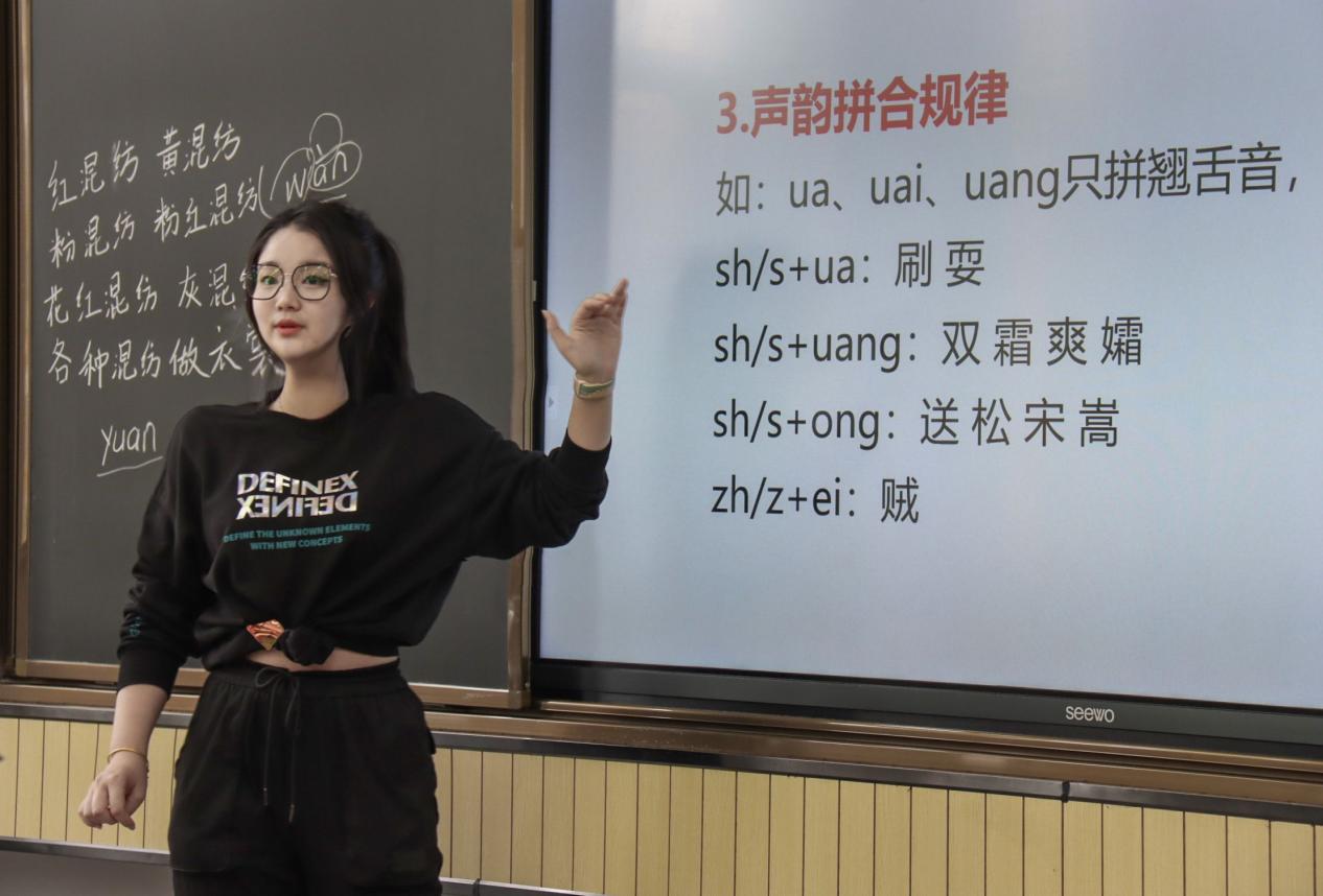 张颖带领学员们复习了口部操,并简要介绍本次声母培训的主要内容。她以图文讲解、单字训练、词语拼读、绕口令挑战、短文朗读、视频观看等形式带领在场师范生认识不同声母的发音方法、掌握声韵拼合规律、区别易错易混的声母发音,激发了学员们对普通话的兴趣,提升课堂效率。