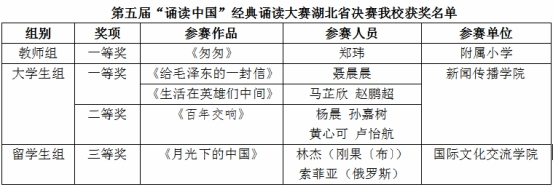 当代师范生讯(通讯员:师凡)近日,第五届“诵读中国”经典诵读大赛湖北省决赛奖项发布。我校获得一等奖3项、二等奖1项、三等奖1项的优异成绩,学校荣获优秀组织奖,全部作品推送参加全国决赛。