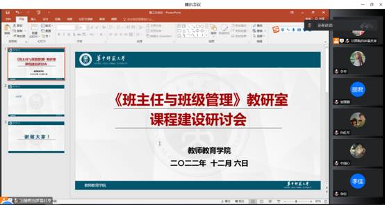 2022年12月6日14:00,我校“班主任与班级管理”教研室第三次课程建设研讨会线上会议通过腾讯会议举行,教研室全体成员参与。此次会议的核心议题是:“班主任与班级管理”课程的教材/教学大纲研制(二)。会议上,教材/教学大纲各负责人员汇报了各自的相关内容准备工作、疑难及问题点,通过讨论调整了大纲部分章节内容,确立了教材/教学大纲各章节的的二级和三级标题。华中师范大学出版社杨宁编辑从教材编写规范的角度,从规范使用图表、规范引用国标参考文献、知识点和案例的二维码植入等方面做了说明。最后,周东明主任对教材大纲标题、教材内容、整体结构以及编写进度方面做了相应的要求。教研室团队成员基于此次会议的讨论成果和相关要求,继续开展教材编写工作。