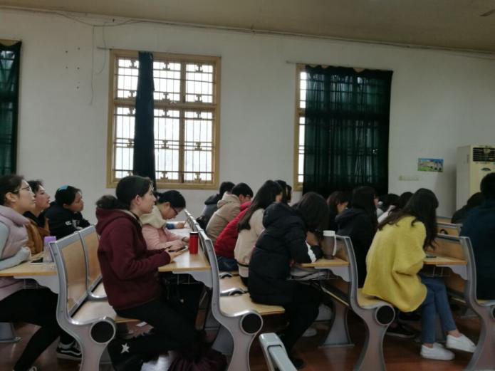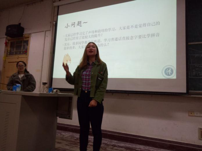 在培训过程中,主讲人讲的火热,同学们同样听地认真。许多同学默默地用手机拍下投影的内容,并在培训的间隙轻声训练,以期在回答问题时能展现更饱满的情绪,更字正腔圆的读音。