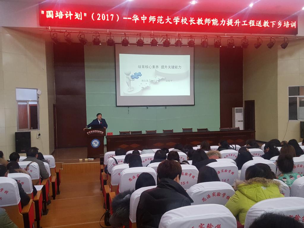 1月11日下午,返岗学员以县为单位,汇报了在返岗实践阶段工作中的困惑、学校行动改进措施以及对培训的建议。洪早清、田恒平教授分别对学员的《学校中长期发展规划》开展了现场交流座谈反馈,给予了指导评价。1月12日,在罗田县思源实验学校,田恒平教授还为罗田县160名中小学教师作了题为《培育核心素养,提升关键能力》的专场送教报告。