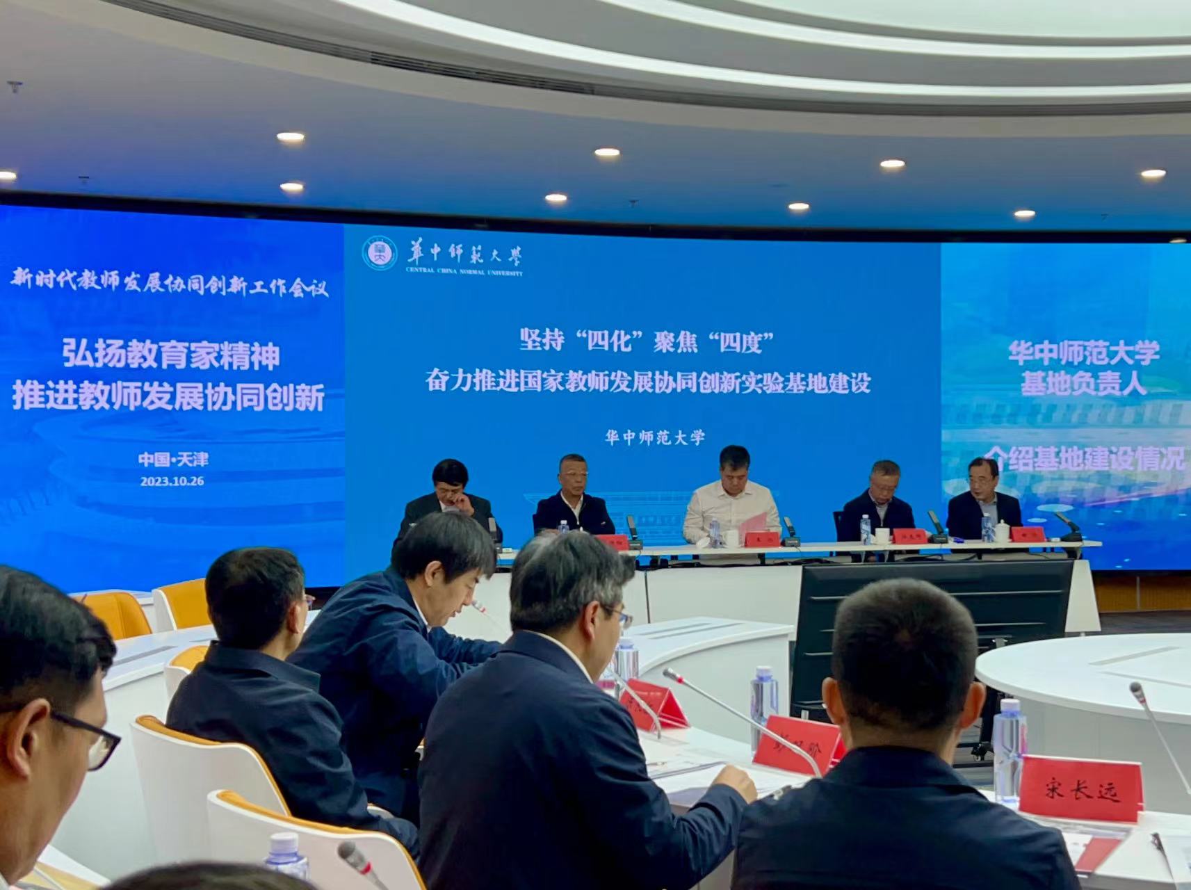 华大在线讯 10月26日,新时代教师发展协同创新工作会议在天津师范大学召开。副校长彭双阶以《坚持“四化” 聚焦“四度” 奋力推进国家教师发展协同创新实验基地建设》为题,介绍了学校基地体系化建设的创新实践。